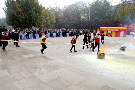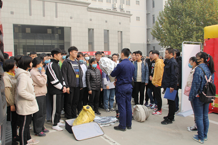 本次活动分为消防安全知识讲座、火场疏散逃生、穿越逃生屋、扑救初期火灾及消防队与学生互动五个环节。上午9点30分,保卫科邀请到了石家庄市护尔消防培训中心的戴孟老师在博学楼九楼报告厅开展了消防安全知识培训。戴老师就宿舍用电安全、日常电器使用、初期火灾的预防和自救进行了细致的讲解。消防安全知识讲座后,工作人员在博学楼报告厅施放了人工模拟烟雾,随后,学院安保人员和学生、微型消防站工作人员分别形成第一、第二灭火力量,开展初期扑救、组织疏散“火场”人员并迅速报警。参与演练人员在工作人员引导下,采取低身捂鼻姿势有序撤离博学楼,整个疏散过程有条不紊。消防疏散演练结束后,保卫科工作人员在博学楼前广场为师生现场讲解了防火、自救、消防器材的使用方法等,组织师生分组进行了穿越逃生屋、使用灭火器灭火、与消防救援队互动、使用消防水带灭火的模拟演练,切实有效的提高了师生对消防安全知识的直观认识,熟知了消防器材的使用方法并熟练掌握逃生技能。