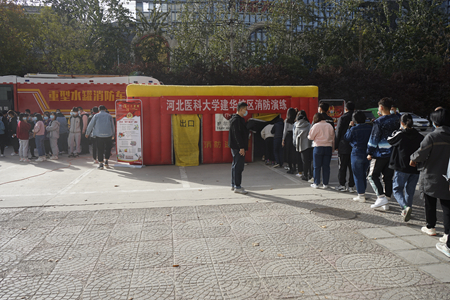本次活动分为消防安全知识讲座、疏散逃生、穿越逃生屋、扑救初期火灾及消防队与学生互动五个环节。上午9时00分,保卫科邀请到了石家庄市护尔消防培训中心的曹老师在博学楼九楼报告厅开展了消防安全知识培训。曹老师就火灾预警、初期火源的处理、高层疏散、消防器材的使用等进行了细致的讲解。消防安全知识讲座后,工作人员在博学楼报告厅施放了人工模拟烟雾,随后,学院安保人员和学生、微型消防站工作人员分别形成第一、第二灭火力量,开展初期扑救、组织疏散“火场”人员并迅速报警。参与演练人员在工作人员引导下,采取低身捂鼻姿势有序撤离博学楼,整个疏散过程有条不紊。消防疏散演练结束后,保卫科工作人员在博学楼前广场为师生现场讲解了防火、自救、消防器材的使用方法,组织师生分组进行了穿越逃生屋、使用灭火器灭火、与富强消防中队互动等模拟演练,切实提高了师生对消防安全知识的直观认识,熟知了消防器材的使用方法,熟练掌握了逃生技能。